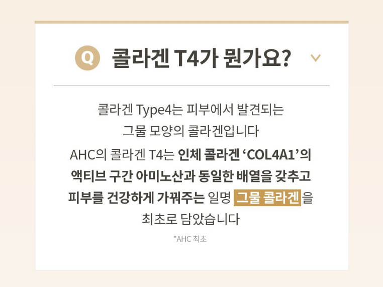 콜라겐 Type4는 피부에서 발견되는 그물 모양의 콜라겐이에요. AHC의 콜라겐 T4는 인체 콜라겐의 액티브 구간 아미노산과 동일한 배열을 갖추고 피부를 건강하게 가꿔주는 일명 그물 콜라겐을 최초로 담았어요.